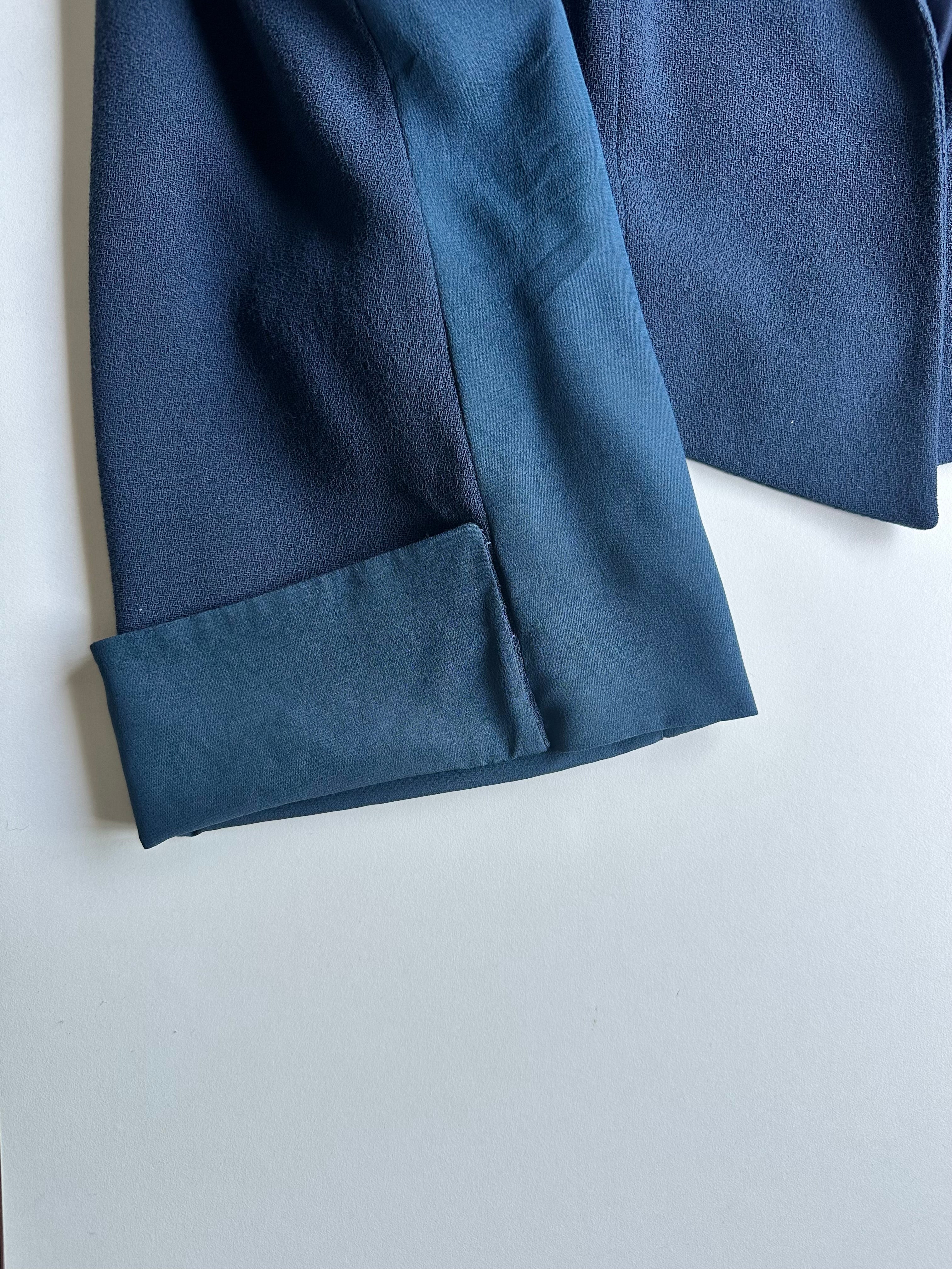 A cropped open blazer in fluid navy crepe with a relaxed, oversized silhouette. No closure — worn draped. Oversized cuffs with a generous 17.5" opening give the sleeve a sculptural, almost cape-like quality. Silk lining. The proportions are intentionally generous, lending the piece an ease that reads as effortless rather than tailored.